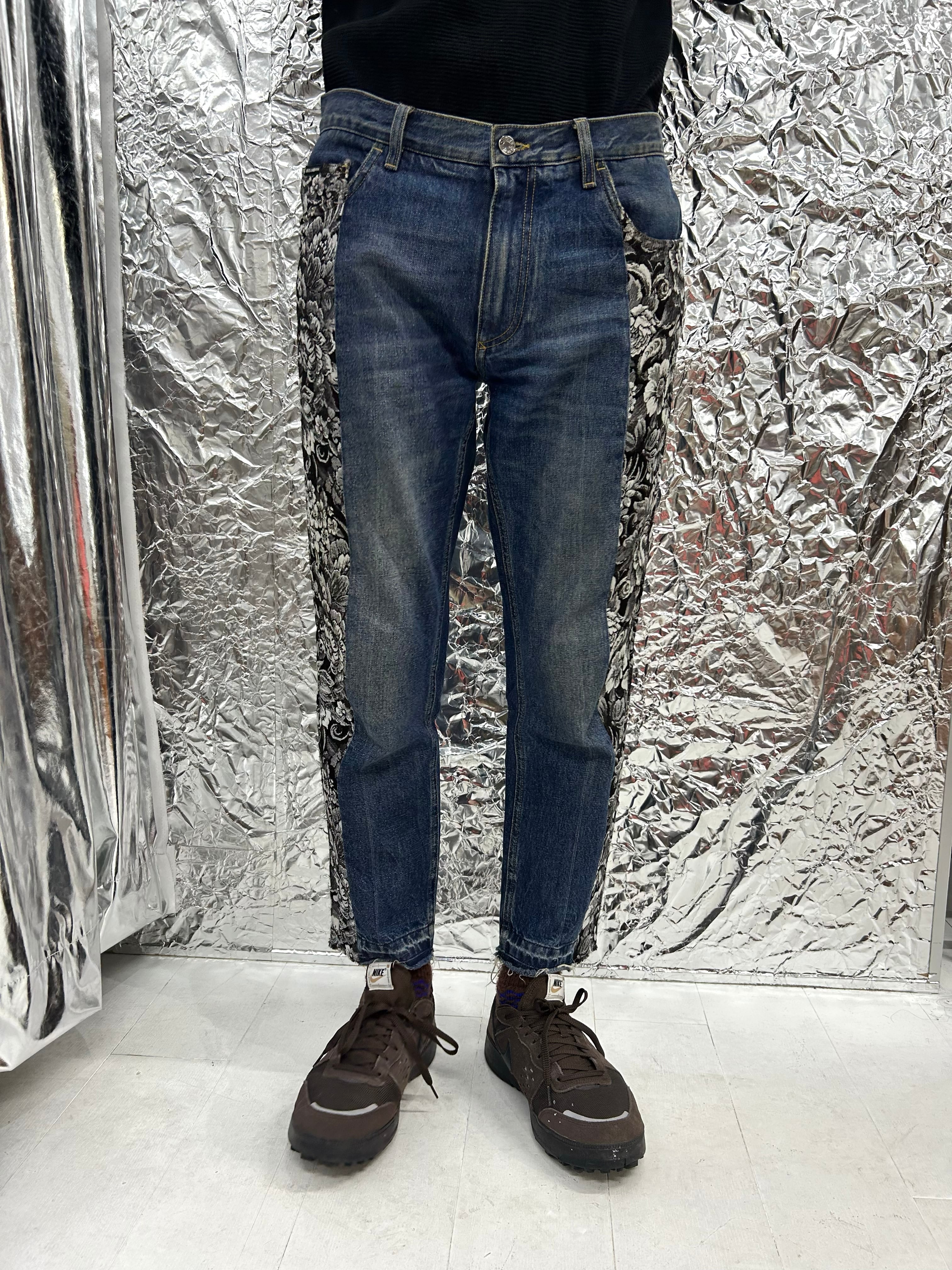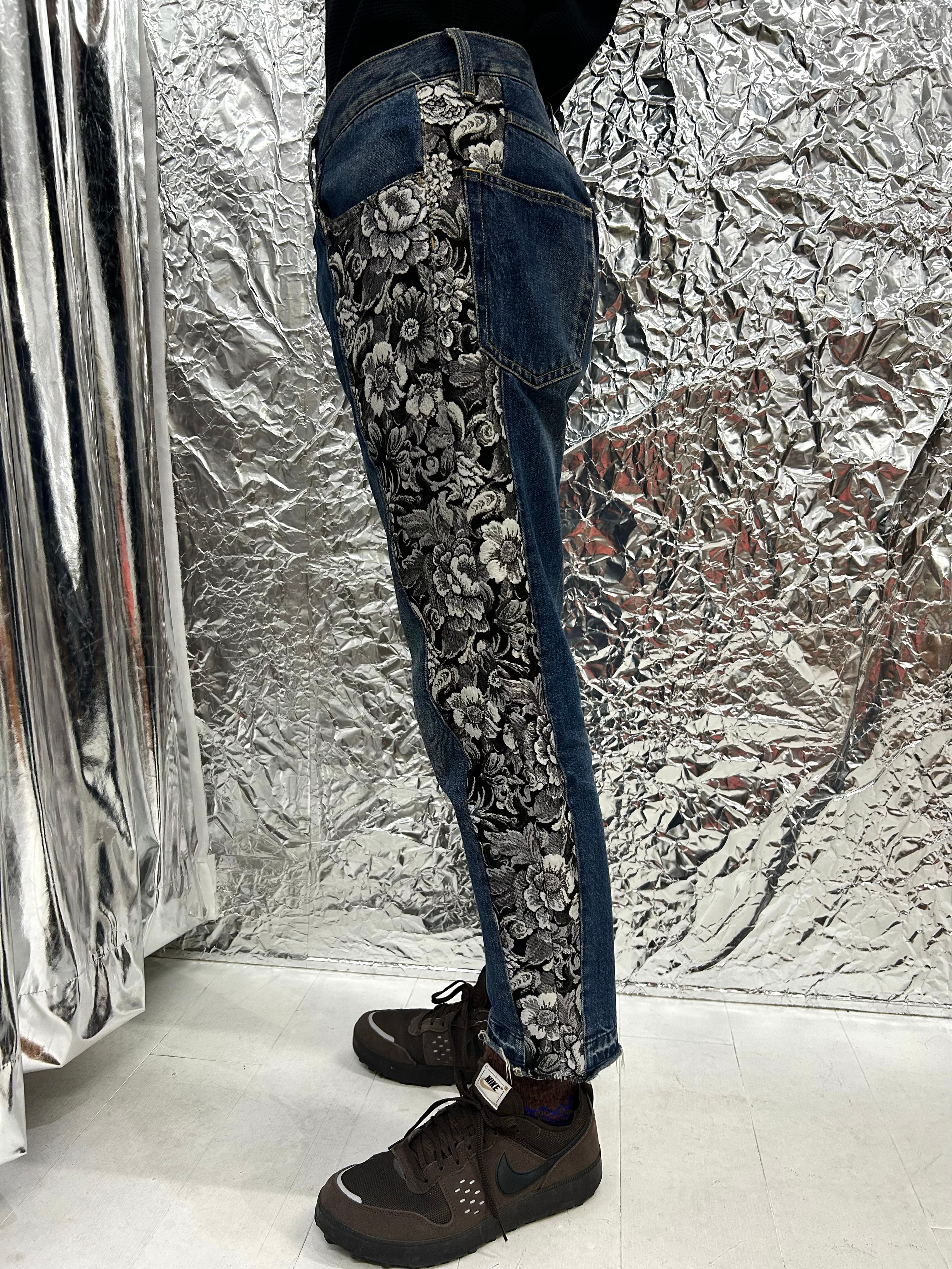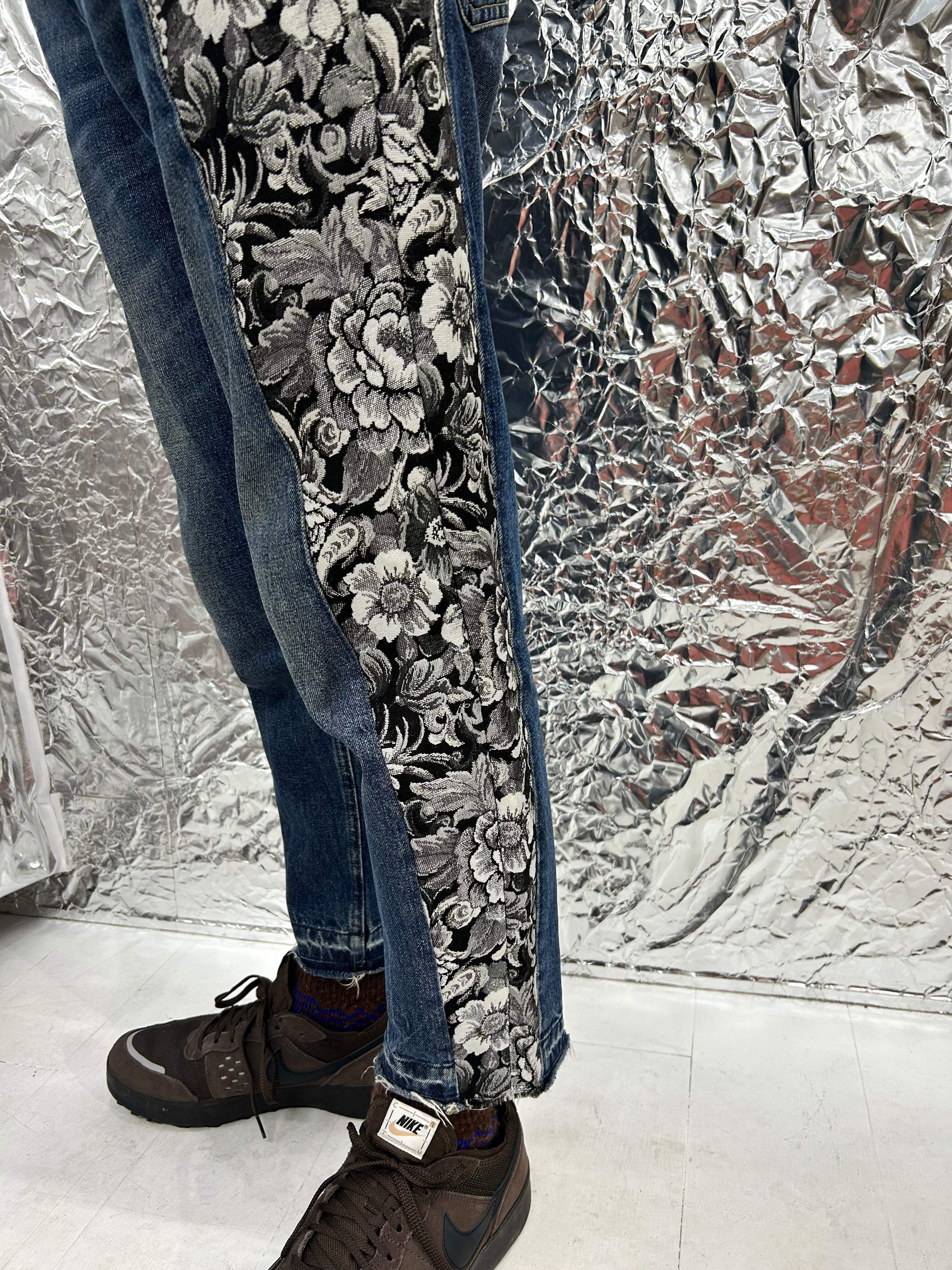 サイドが花柄のジャガー織りの切り返しになっているデニムパンツ。少しテーパードが効いています。