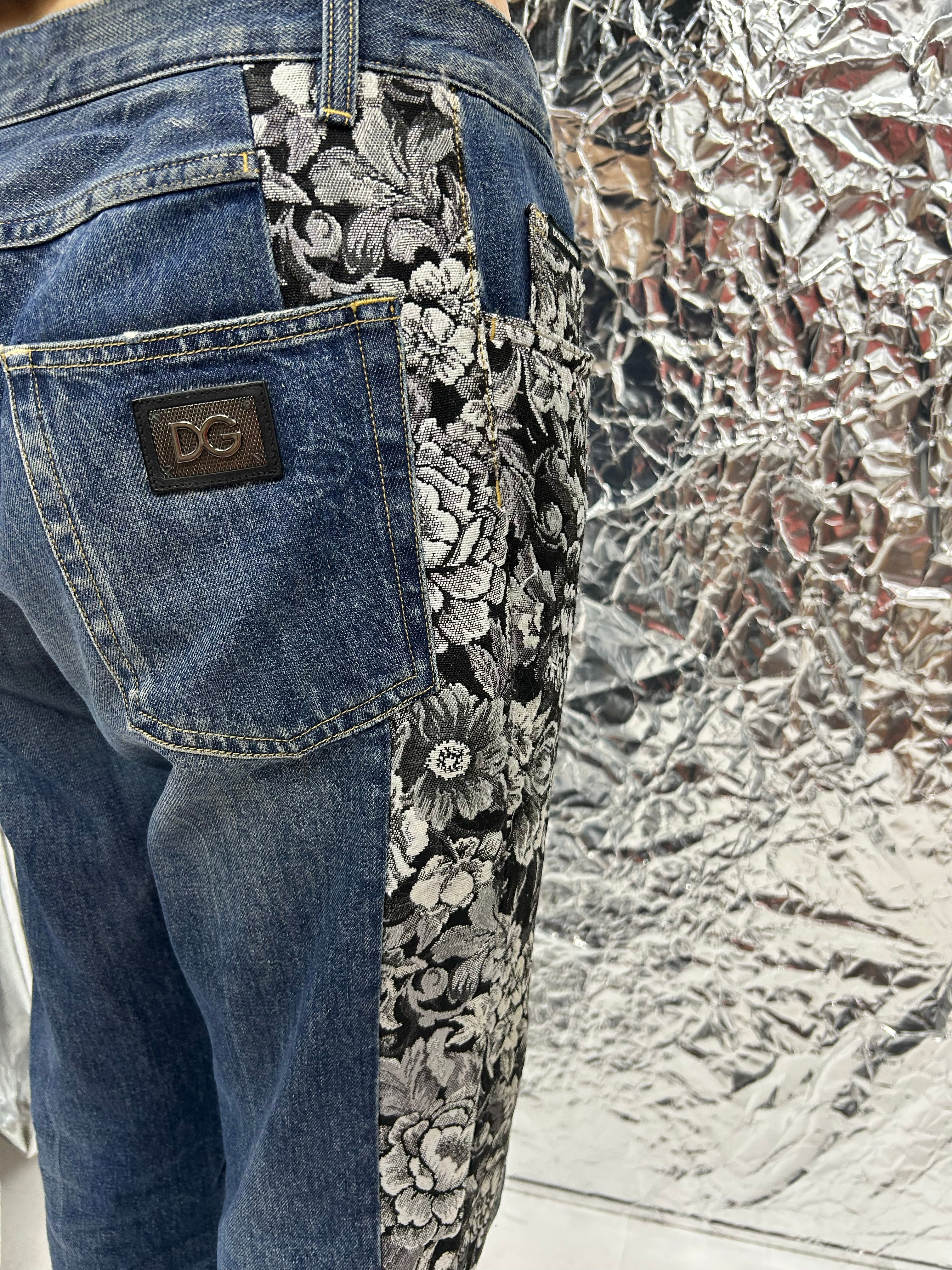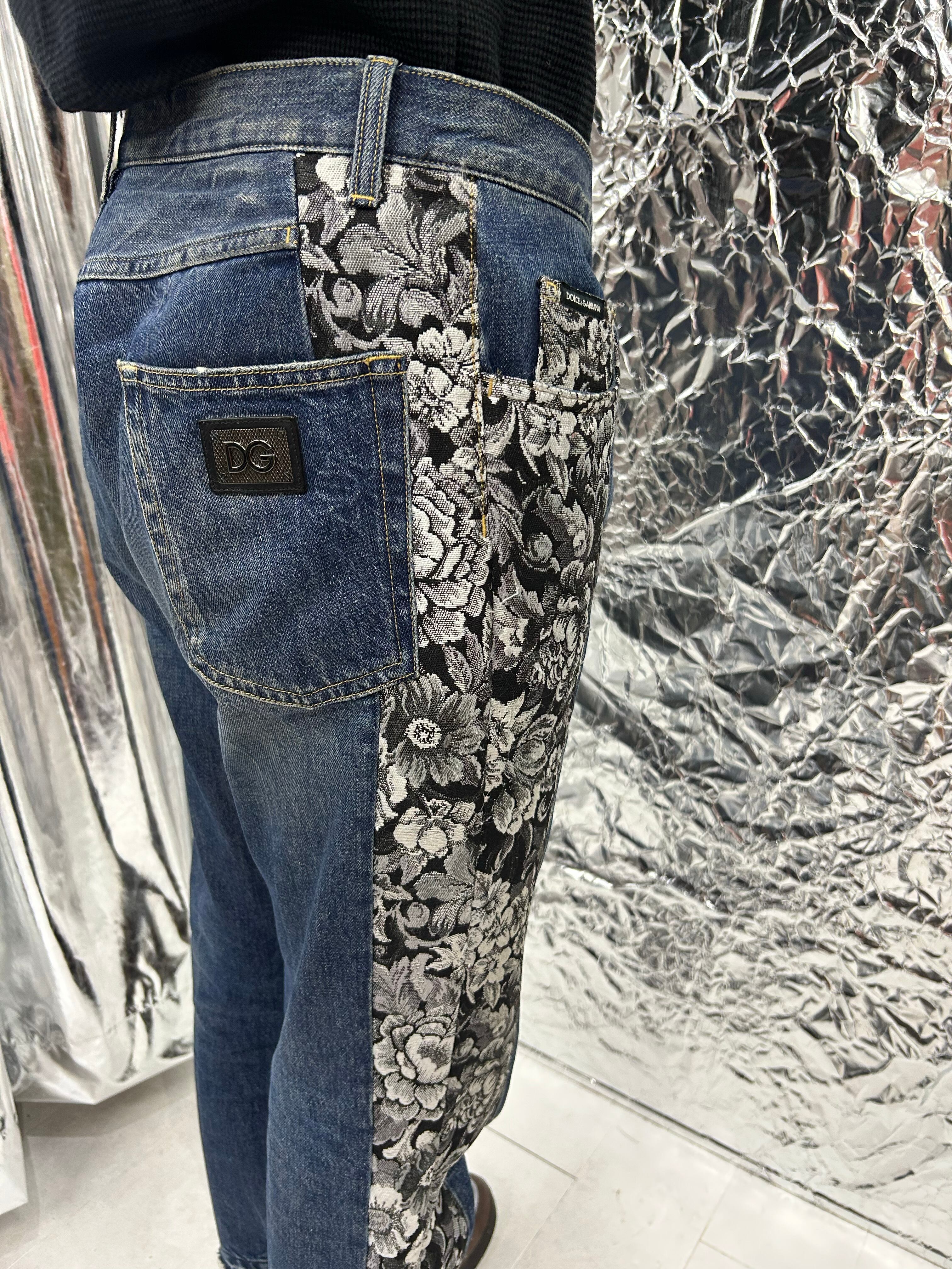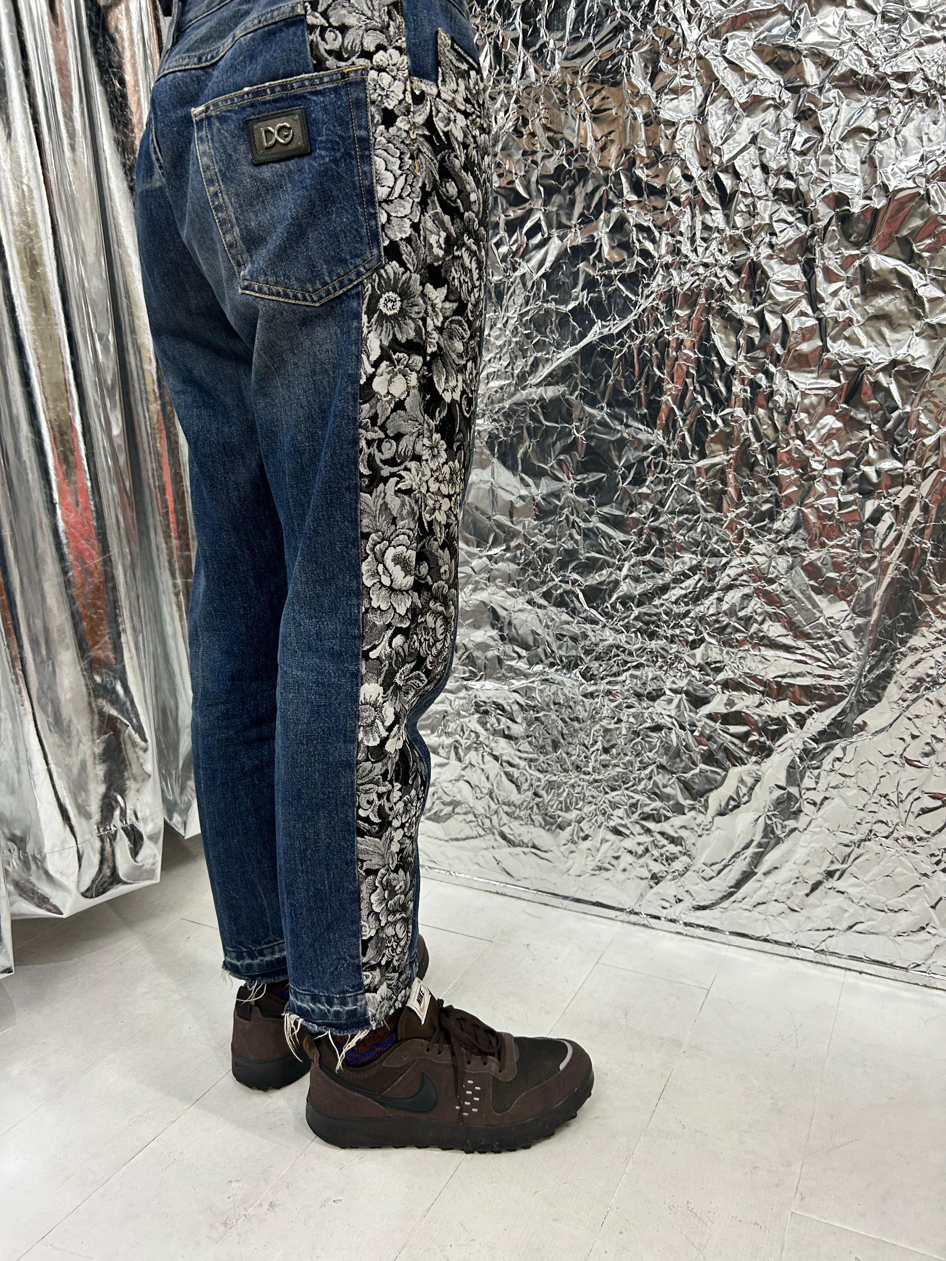 サイドが花柄のジャガー織りの切り返しになっているデニムパンツ。少しテーパードが効いています。